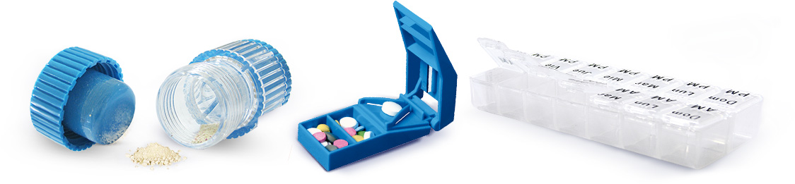 El partidor de pastillas, El triturador de pastillas y pastilleros en general. Los pastilleros, han sido diseñados como ayuda para que el paciente no olvide la ingesta de sus pastillas (de acuerdo a los horarios establecidos por la prescripción médica), lo cual sucede con mayor frecuencia en los adultos mayores.
